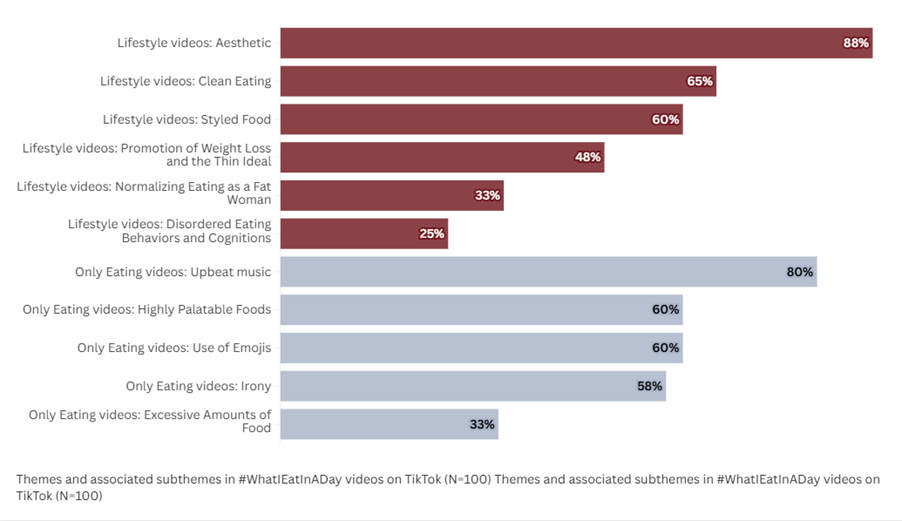 What is most troubling, is that nearly half of these Lifestyle videos explicitly promoted weight loss and the thin ideal. You see creators stepping on scales, calorie counts are displayed, often totalling less than 1,500 across an entire day. The majority of these creators were thin, white, feminine-presenting women. Eating disorder content appeared in 25% of Lifestyle videos, including discussions of binge eating, laxative misuse, meal skipping, and restrictive behaviours.