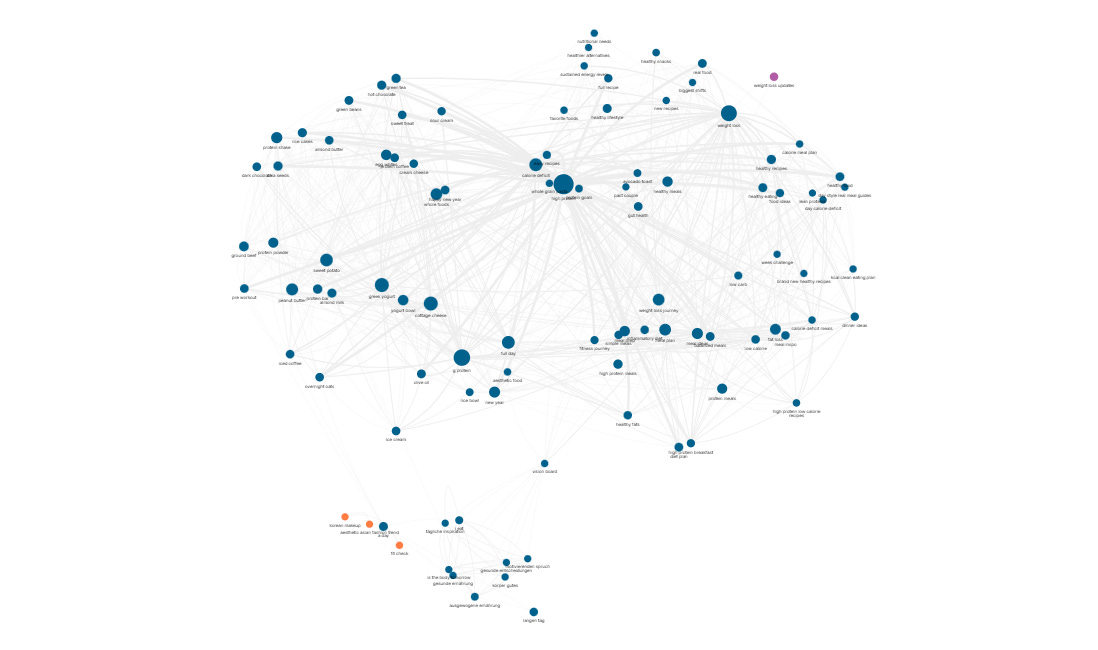 Recent social listening data from YouScan confirms that high-protein foods and calorie deficit strategies dominate the conversation. But when you look closer, you notice that niche items like olive oil, chia seeds, and green tea are mentioned consistently in unique contexts rather than repeatedly by the same voices.. More surprisingly, items like sour cream and hot chocolate frequently occur frequently in the same conversations as high protein, suggesting a mix of indulgence and healthy eating. This shows that WIEIAD videos is not be just about either deprivation or indulgence. It’s about the performance of balance, the aesthetic of having it both ways.